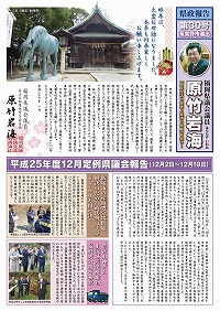 • ・平成25年度12月定例県議会報告(12月2日~12月19日 合計27件の議案可決)/補正予算/ICT教育状況・産業廃棄物処分場・県保険環境研究所・農業総合試験場・九州国立博物館行政視察/代表質問 来年度予算編成方針/大牟田市三川炭鉱じん爆発50年知事見解・教育委員会予算編成方針/意見書 「合併算定替終了後の新たな財政支援措置を求める意見書」提出及び採択