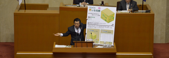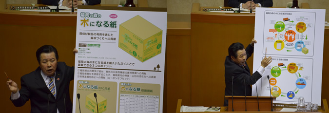 低迷する林業の振興を願い、県産の間伐材を利用した「福岡の森の『木になる紙』」について質問する。